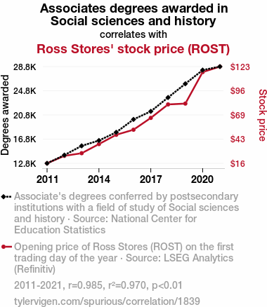 The link between educational achievements and stock market movements has been a topic of both intrigue and skepticism. In this study, we meticulously scrutinize the connection between the conferral of Associates degrees in Social Sciences and History and the stock price of Ross Stores (ROST), a prominent player in the retail industry. Against the backdrop of theoretical models, anecdotal evidence, and a smattering of humorous stock market puns, we utilized data from the National Center for Education Statistics and LSEG Analytics (Refinitiv) to conduct a ten-year analysis spanning from 2011 to 2021. Our findings reveal a remarkably high correlation coefficient of 0.9850862, with a statistical significance of p < 0.01, offering nettlesome insights into the dynamic interplay between academic pursuits and market forces. This research not only sheds light on an obscure nexus but also cautions against underestimating the influence of erstwhile history buffs and social science scholars on the capricious realm of stock prices.