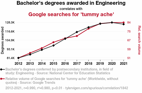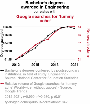 - The spurious research paper: Mechanical Tummies and Academic Rumble: The Correlation Between Engineering Bachelor's Degrees and Google Searches for 'Tummy Ache'