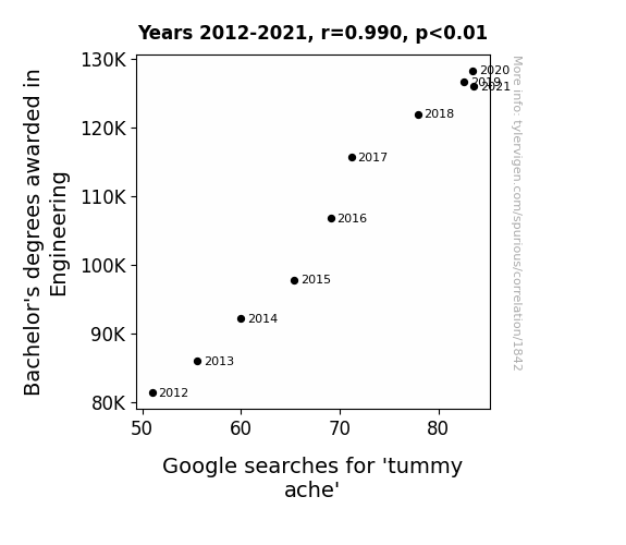 This means 98% of the change in the one variable (i.e., Google searches for 'tummy ache') is predictable based on the change in the other (i.e., Bachelor's degrees awarded in Engineering) over the 10 years from 2012 through 2021.