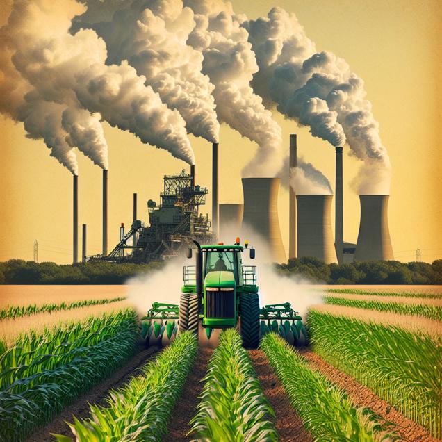 ChatGPT: In a vast cornfield in Texas, tall, green stalks of genetically modified corn sway in the breeze. In the background, a tractor powered by fossil fuel plows through the field, tilling the soil for planting. Both the GMO corn and the tractor represent the intersection of GMO use in agriculture and the reliance on fossil fuels for farming practices.