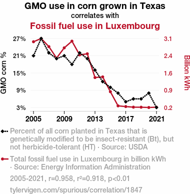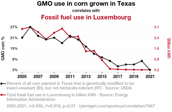 - The spurious research paper: Maize and Petroleum: Unearthing the Correlation Between GMO Corn Cultivation in Texas and Fossil Fuel Consumption in Luxembourg