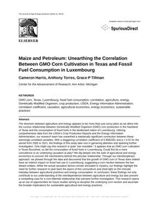 User prompt: Please provide potential search keywords for a paper titled Maize and Petroleum: Unearthing the Correlation Between GMO Corn Cultivation in Texas and Fossil Fuel Consumption in Luxembourg with an abstract of The diversion between agriculture and energy appears to be more than just corny jokes as we delve into the curious relationship between Genetically Modified Organism (GMO) corn production in the heartland of Texas and the consumption of fossil fuels in the landlocked nation of Luxembourg. Utilizing comprehensive data from the USDA's Crop Production Reports and the Energy Information Administration, our research team has unearthed a statistically significant connection between these seemingly unrelated variables. With a staggering correlation coefficient of 0.9582281 and p < 0.01 for the period from 2005 to 2021, the findings of this study take root in garnering attention and sparking further investigation.