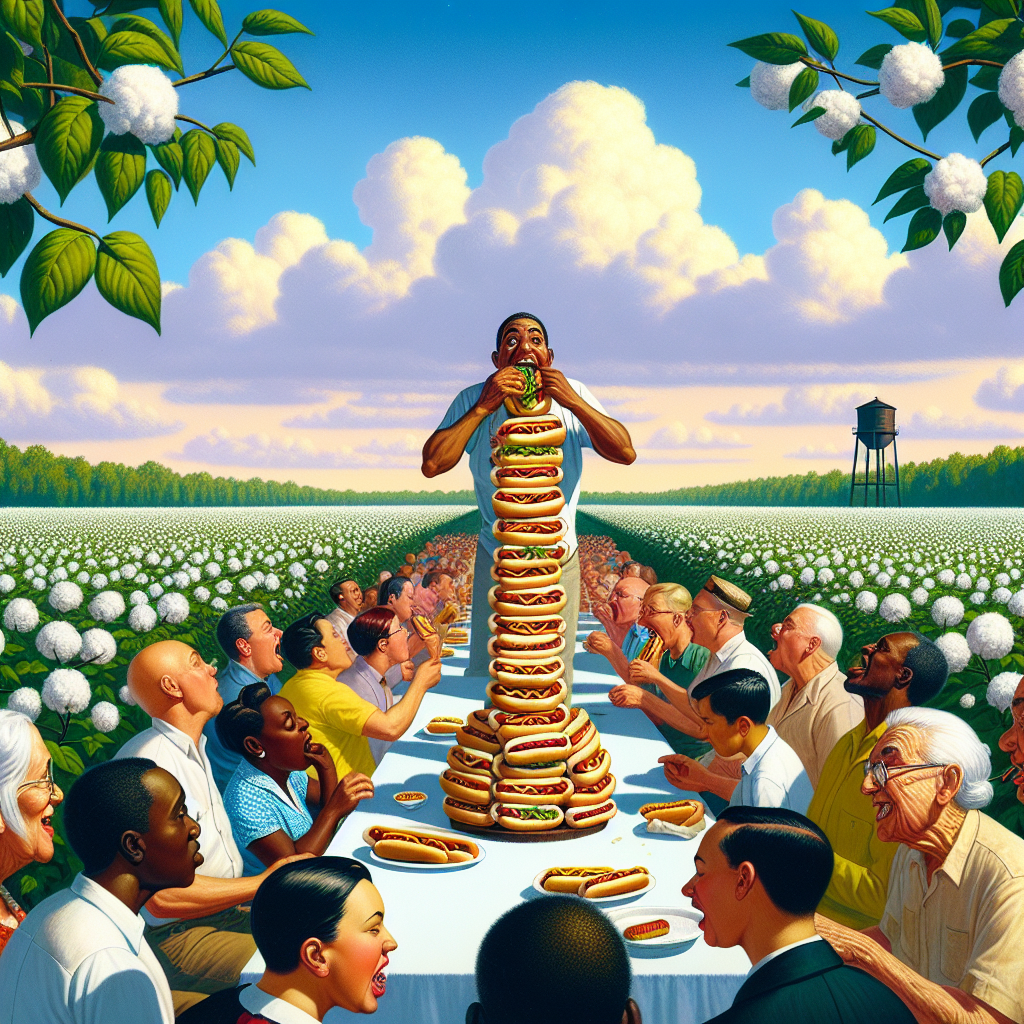 User prompt: Please describe a visual scene that prominently depicts both GMO use in cotton in Mississippi and Hotdogs consumed by Nathan's Hot Dog Eating Competition Champion together. Keep the description simple.