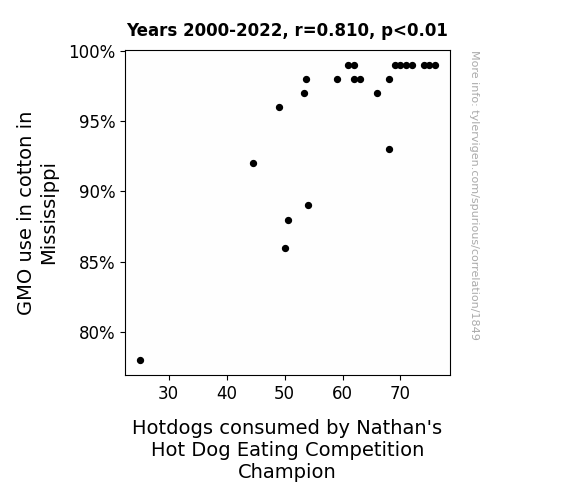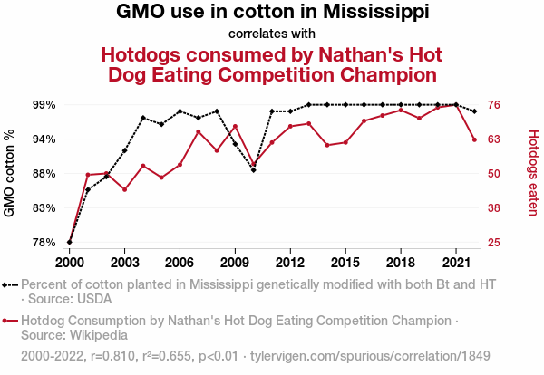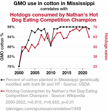 - The spurious research paper: Unbundling the Buns: Unraveling the Interplay between GMO Cotton Cultivation in Mississippi and Nathan's Hot Dog Eating Contest Champion's Consumption
