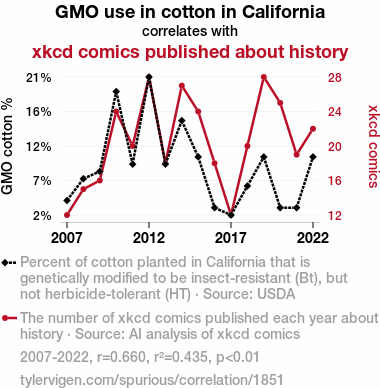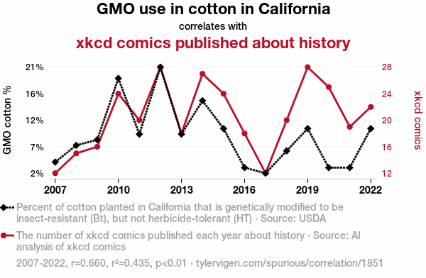 This means 43.5% of the change in the one variable (i.e., xkcd comics published about history) is predictable based on the change in the other (i.e., GMO use in cotton in California) over the 16 years from 2007 through 2022.