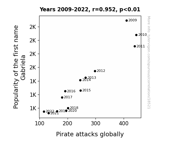 This means 90.7% of the change in the one variable (i.e., Pirate attacks globally) is predictable based on the change in the other (i.e., Popularity of the first name Gabriela) over the 14 years from 2009 through 2022.