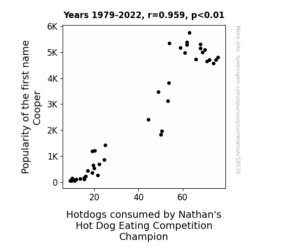 This means 91.9% of the change in the one variable (i.e., Hotdogs consumed by Nathan's Hot Dog Eating Competition Champion) is predictable based on the change in the other (i.e., Popularity of the first name Cooper) over the 44 years from 1979 through 2022.
