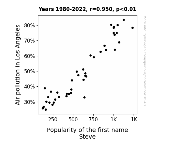 This means 90.3% of the change in the one variable (i.e., Popularity of the first name Steve) is predictable based on the change in the other (i.e., Air pollution in Los Angeles) over the 43 years from 1980 through 2022.