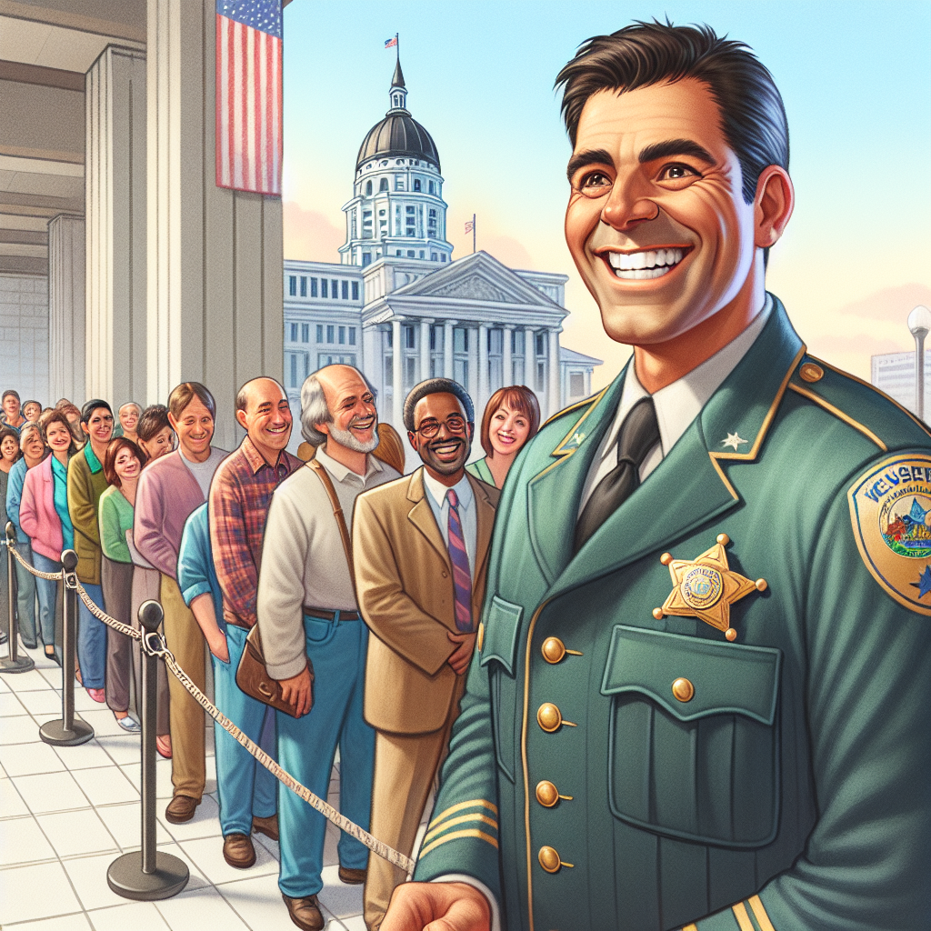 ChatGPT: Generate a whimsical illustration of a bustling Kansas courthouse, where a cheerful bailiff named Sonny stands at the center, beaming warmly as he greets the gathering crowd. Show a long line forming, filled with people eagerly seeking his assistance, with some shaking his hand and others looking up to him with admiration. Emphasize Sonny's popularity by portraying the growing number of individuals lining up to seek his help, creating a heartwarming and bustling scene.