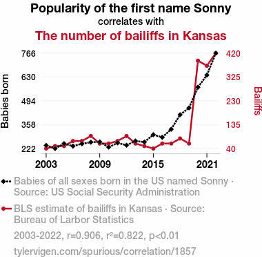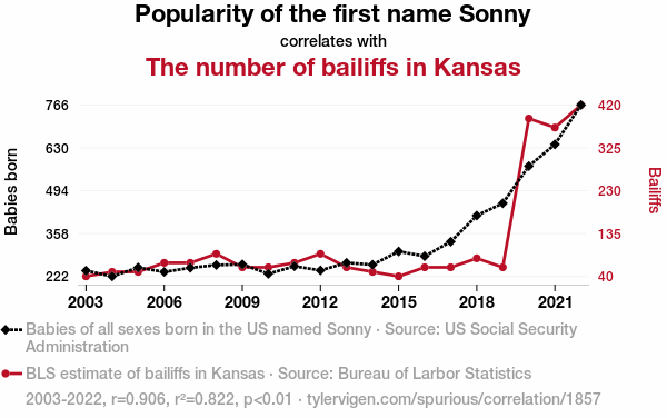 This means 82.2% of the change in the one variable (i.e., The number of bailiffs in Kansas) is predictable based on the change in the other (i.e., Popularity of the first name Sonny) over the 20 years from 2003 through 2022.