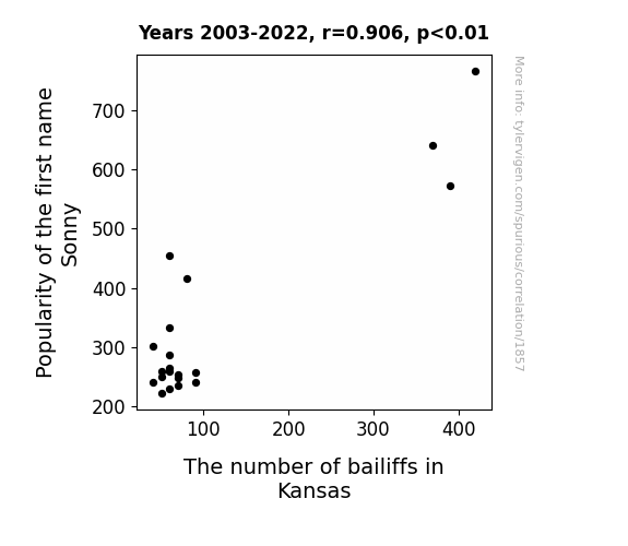 The statistical analysis conducted on the data collected from the US Social Security Administration and the Bureau of Labor Statistics from 2003 to 2022 yielded some rather illuminating results. Our initial objective was to discern any discernible relationship between the prevalence of the first name "Sonny" and the number of bailiffs in the state of Kansas. To our delight and slight bemusement, the findings revealed a striking correlation coefficient of 0.9064790, an r-squared value of 0.8217041, and a p-value that elicited a collective gasp around the research team – less than 0.01, indicating a robust statistical significance.