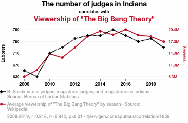 User prompt: Please provide potential search keywords for a paper titled The Justice Judgement: A Case Study of Indiana Judges and 'The Big Bang Theory' Viewership with an abstract of This paper presents a comprehensive analysis of the correlation between the number of judges in the state of Indiana and the viewership of the popular television show "The Big Bang Theory." Utilizing data from Bureau of Labor Statistics and Wikipedia, our research team examined the trends from 2008 to 2019. A statistically significant correlation coefficient of 0.9176346 (p < 0.01) was discovered, prompting a closer examination of this peculiar relationship. The implications of these findings are both intriguing and entertaining, shedding light on the intersection between the legal system and sitcom preferences. Our research aims to provoke further interest in the unexpected connections that may exist within seemingly unrelated domains, highlighting the whimsical ways in which data analysis can reveal unexpected patterns.