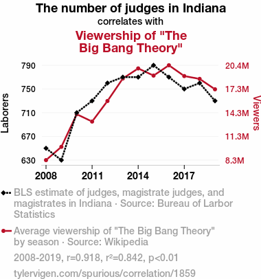 This means 84.2% of the change in the one variable (i.e., Viewership of "The Big Bang Theory") is predictable based on the change in the other (i.e., The number of judges in Indiana) over the 12 years from 2008 through 2019.