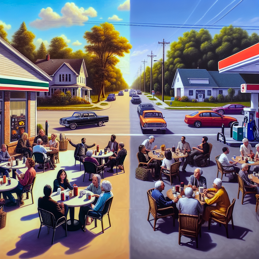 ChatGPT: Generate an image that merges a tranquil Michigan town café, where a group of sociologists engage in lively discussions, with a bustling gas station in Cyprus. The peaceful scene of sociologists in the café should be contrasted with the busy activity at the gas station, where cars are lining up to pump gasoline. The visual should represent the different numbers of sociologists in Michigan and the amount of gasoline being pumped in Cyprus. The composition should capture the contrast between the academic gathering and the fueling station, emphasizing the tranquility of the café setting and the vibrant activity of the gas station.