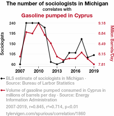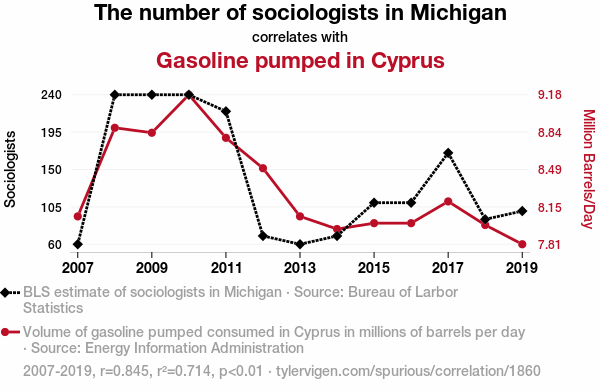 sociologists, Michigan, gasoline consumption, Cyprus, statistical analysis, correlation coefficient, p-value, Bureau of Labor Statistics, Energy Information Administration, quantitative analysis, unexpected relationships, interdisciplinary research, societal influences