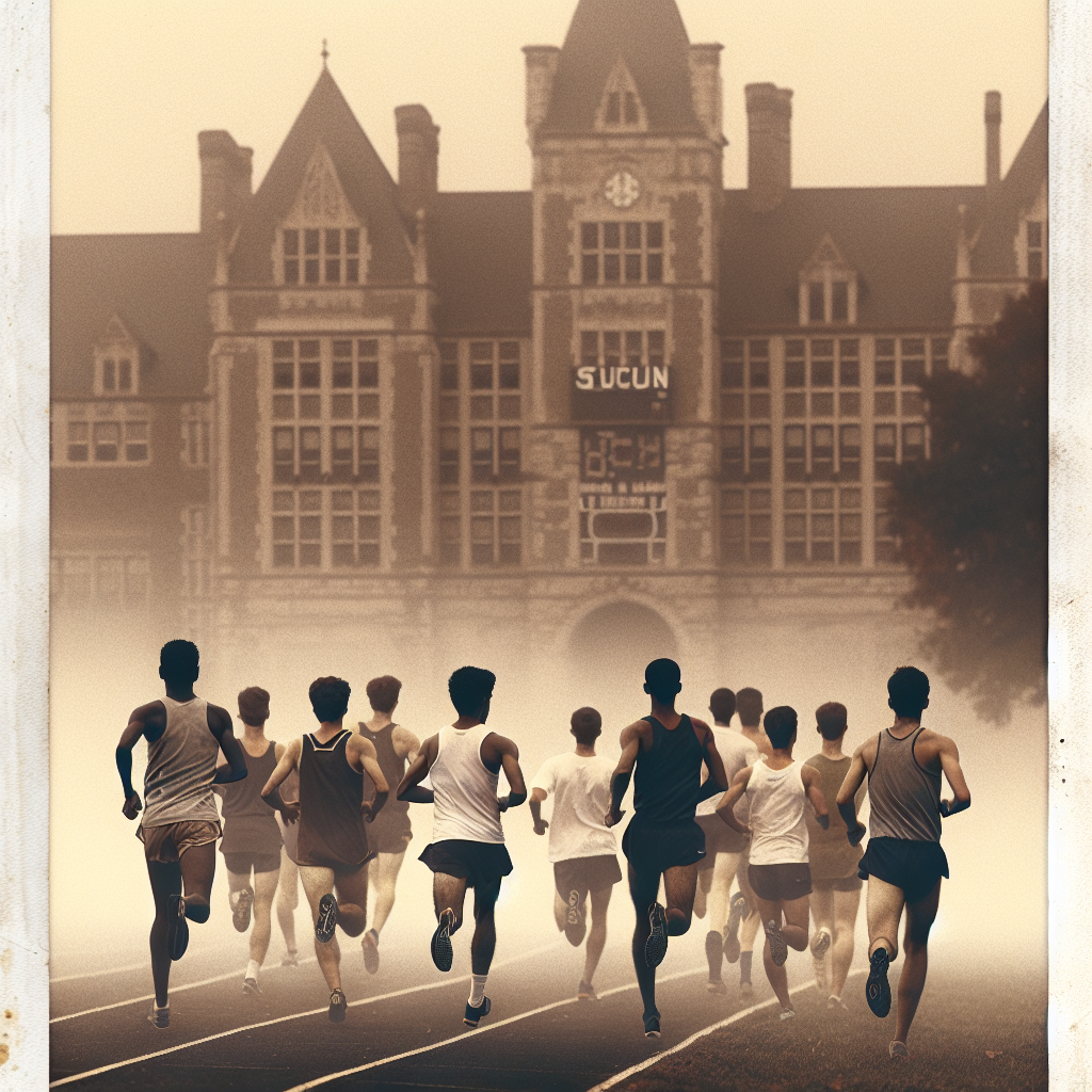 ChatGPT: Generate an image that looks like a vintage Polaroid photo, depicting a group of college runners on a smoggy cross-country course in Staunton, Virginia. The runners are determinedly pushing through the hazy air, ensuring to capture the determination and focus despite the challenging environmental conditions. Their silhouettes are slightly obscured by the smog, conveying the difficult conditions. The overall tone of the image should be nostalgic and determined.