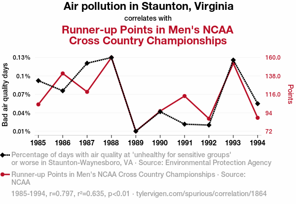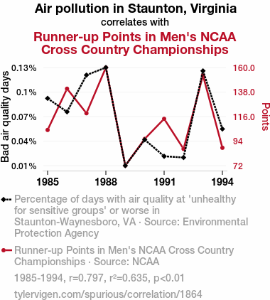 - The spurious research paper: Breathless at the Finish Line: The Relationship Between Air Pollution in Staunton, Virginia and Runner-up Points in Men's NCAA Cross Country Championships