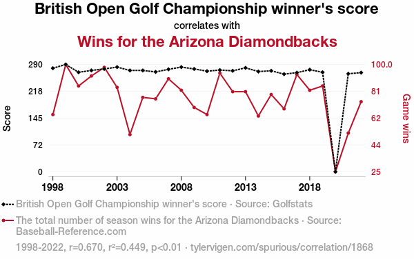 User prompt: Please provide potential search keywords for a paper titled Swing and Hit: A Tee-rific Connection Between British Open Golf Championship Scores and Arizona Diamondbacks' Wins with an abstract of Golf and baseball may seem as different as a birdie and a double play, but our research delved into their unlikely connection. We analyzed data from Golfstats and Baseball-Reference.com over the span of 1998 to 2022 to uncover the fascinating link between the performance of British Open Golf Championship winners and the successes of the Arizona Diamondbacks on the baseball diamond. Our findings revealed a significant correlation coefficient of 0.6701397 and p < 0.01, illustrating a strong relationship that may leave you saying, "Fore!-tunately for the Diamondbacks!