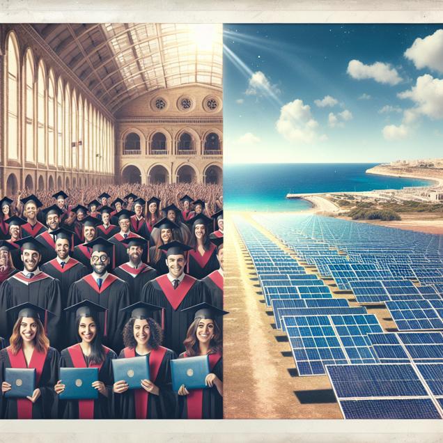 ChatGPT: In a bustling university hall, a group of graduates proudly display their Master's degrees in Communication, journalism, and related programs, celebrating their hard-earned achievements. Meanwhile, on the sunny shores of Malta, rows of solar panels glisten under the bright Mediterranean sun, demonstrating the abundant solar power being generated to fuel the island's energy needs.
