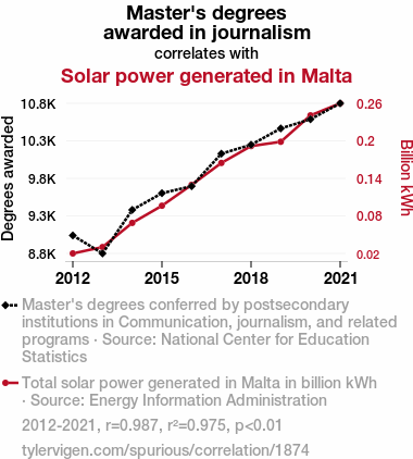 - The spurious research paper: Shine a Light on the Connection: Master's Degrees in Communication, journalism, and related programs and Solar Power Generation in Malta