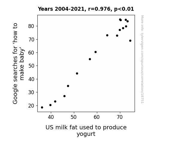 This means 95.3% of the change in the one variable (i.e., US milk fat used to produce yogurt) is predictable based on the change in the other (i.e., Google searches for 'how to make baby') over the 18 years from 2004 through 2021.