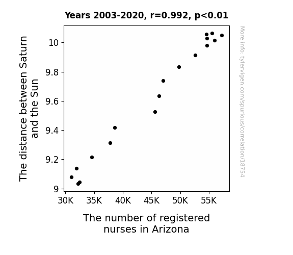 This means 98.4% of the change in the one variable (i.e., The number of registered nurses in Arizona) is predictable based on the change in the other (i.e., The distance between Saturn and the Sun) over the 18 years from 2003 through 2020.