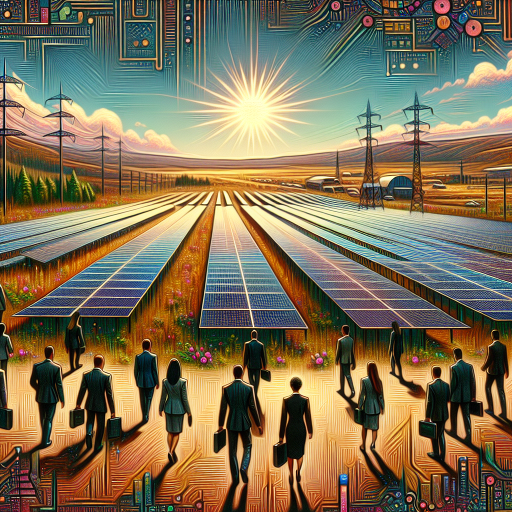 Prompt: Prompt: Generate an image of a sunlit field in Ukraine with rows of solar panels stretching across the landscape. In the distance, a line of lawyers from Washington state gather to observe the innovative solar technology, expressing interest in the potential legal implications and opportunities it presents. Create a cybernetic art style representation capturing the fusion of natural and technological elements, with a futuristic and abstract interpretation. The depiction should include only scenes, people, and objects, it should not include text or speech bubbles.