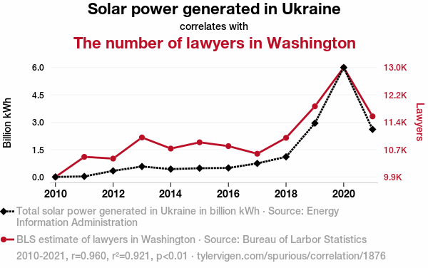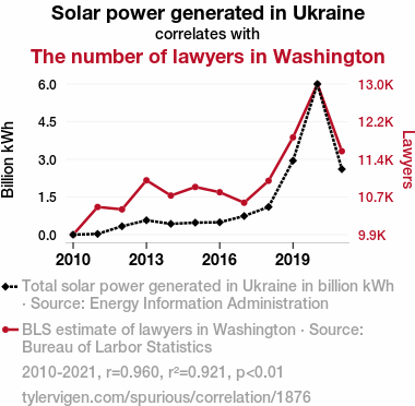 This means 92.1% of the change in the one variable (i.e., The number of lawyers in Washington) is predictable based on the change in the other (i.e., Solar power generated in Ukraine) over the 12 years from 2010 through 2021.