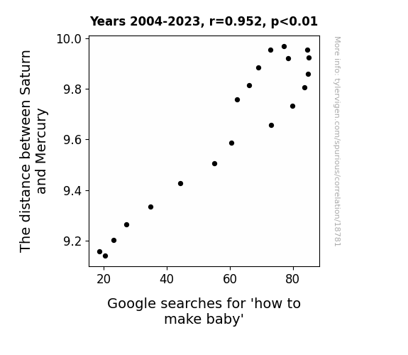 This means 90.6% of the change in the one variable (i.e., Google searches for 'how to make baby') is predictable based on the change in the other (i.e., The distance between Saturn and Mercury) over the 20 years from 2004 through 2023.
