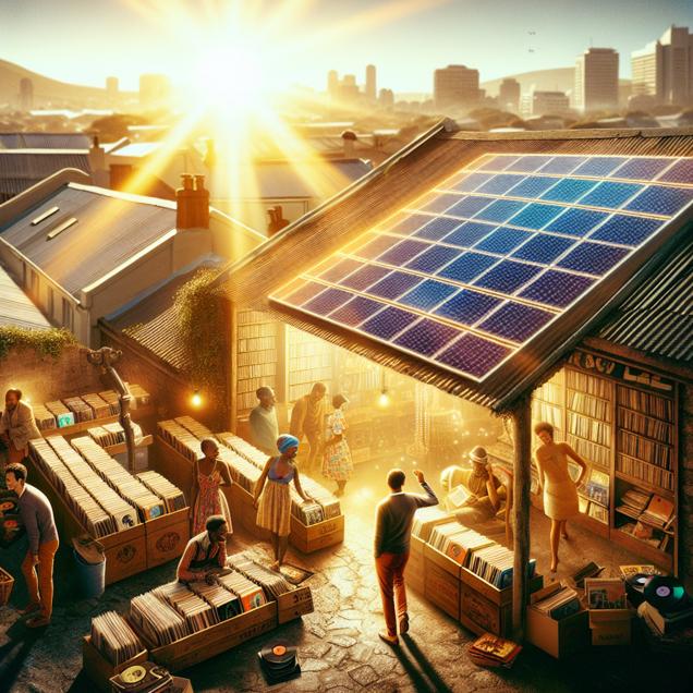 ChatGPT: In South Africa, a rooftop solar panel is basking in the bright sunlight, with rays of sunshine powering it up. Next to it, a cozy record store is bustling with customers, browsing through shelves filled with nostalgic LP and vinyl albums. The warm solar energy blends seamlessly with the nostalgic charm of the music, creating a harmonious scene of sustainable energy and vintage entertainment.