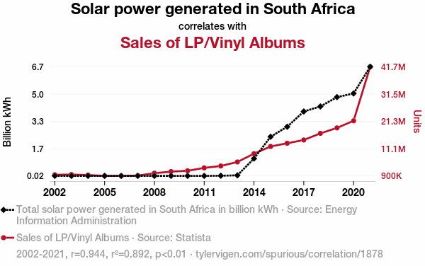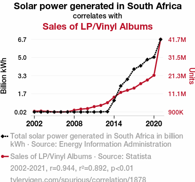This means 89.2% of the change in the one variable (i.e., Sales of LP/Vinyl Albums) is predictable based on the change in the other (i.e., Solar power generated in South Africa) over the 20 years from 2002 through 2021.