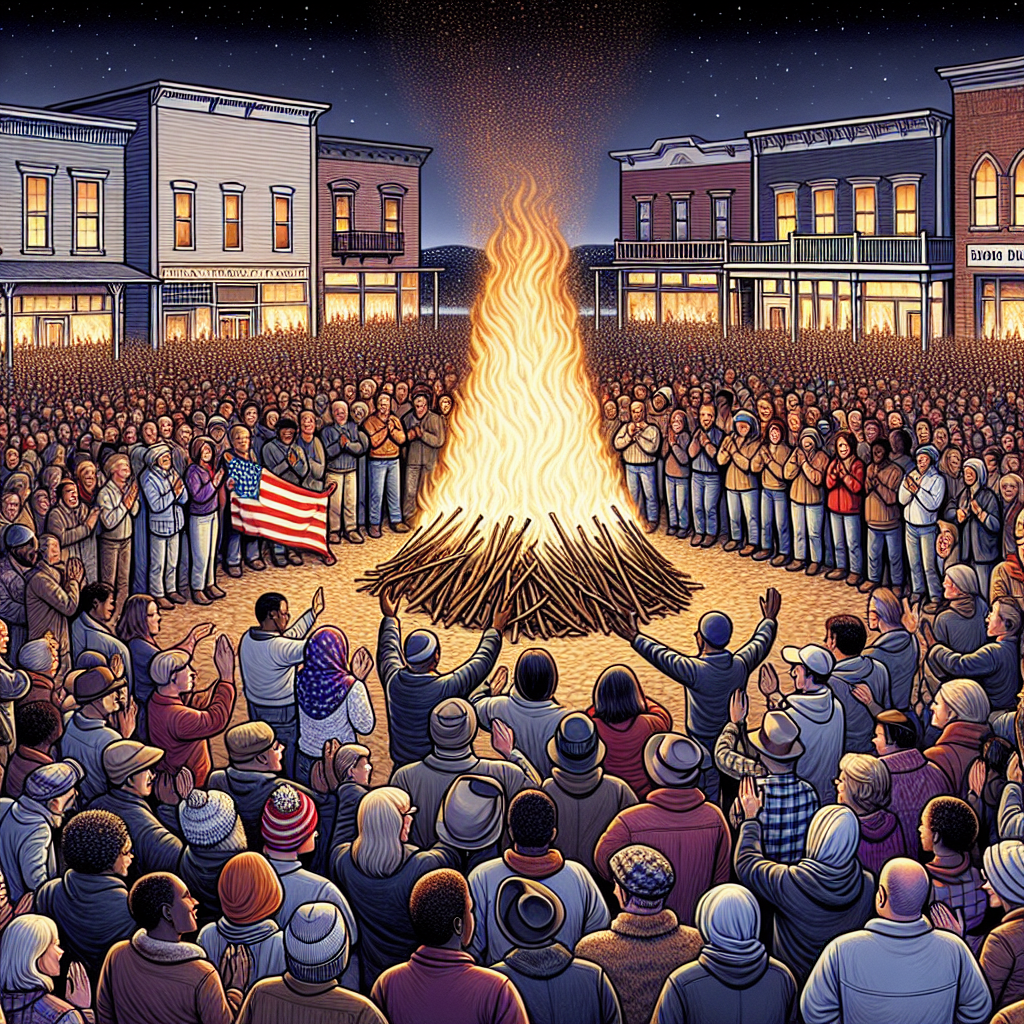 Prompt: Generate an image of a crowded town square in Nebraska where people are gathered around a large bonfire, cheering and clapping as the flames soar high into the night sky. In the midst of the crowd, there is a banner with the name "Baby" being passed around, and people are taking turns posing for photos with it. The combination of the enthusiastic crowd and the fiery spectacle creates a surreal and striking image depicting the intersection between popularity and arson in Nebraska. The depiction should include only scenes, people, and objects, it should not include text or speech bubbles.