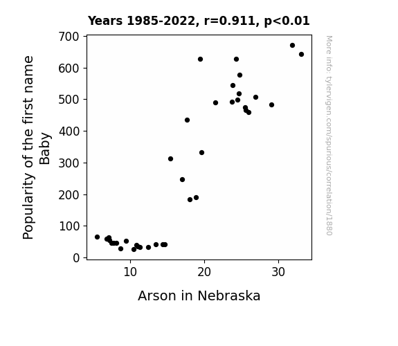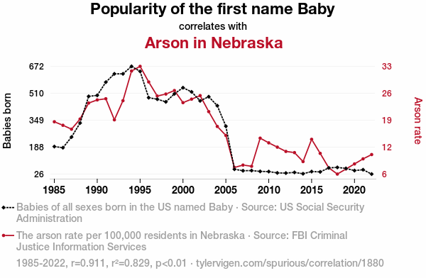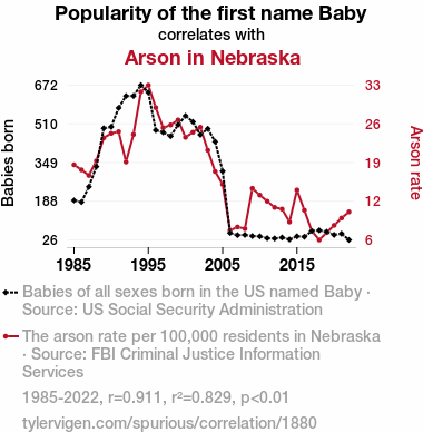 - The spurious research paper: Firestarter or Just Trendy: The Correlation Between Baby's Popularity and Arson in Nebraska