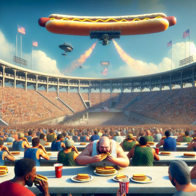 ChatGPT: In a crowded stadium in Florida, people are gathered to watch the Nathan's Hot Dog Eating Competition. In the sky above, a UFO appears, catching the attention of both the crowd and the competitors. As the champion consumes hotdogs at an incredible speed, the UFO hovers mysteriously in the distance, adding an extra layer of excitement to the event.