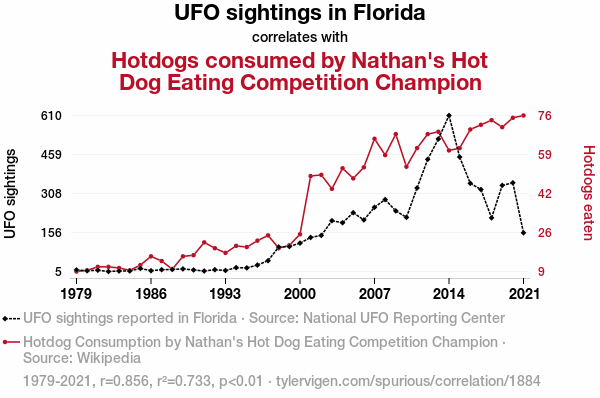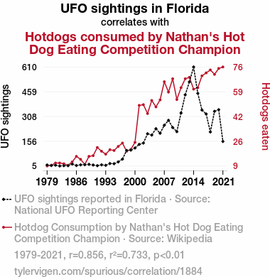 - The spurious research paper: Unidentified Food Objects (UFOs) and Unbeatable Eaters: Exploring the Link Between Florida UFO Sightings and Nathan's Hot Dog Consumption