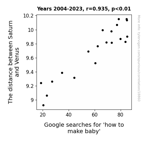 This means 87.4% of the change in the one variable (i.e., Google searches for 'how to make baby') is predictable based on the change in the other (i.e., The distance between Saturn and Venus) over the 20 years from 2004 through 2023.