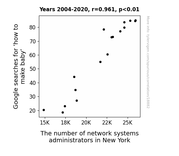 This means 92.3% of the change in the one variable (i.e., The number of network systems administrators in New York) is predictable based on the change in the other (i.e., Google searches for 'how to make baby') over the 17 years from 2004 through 2020.