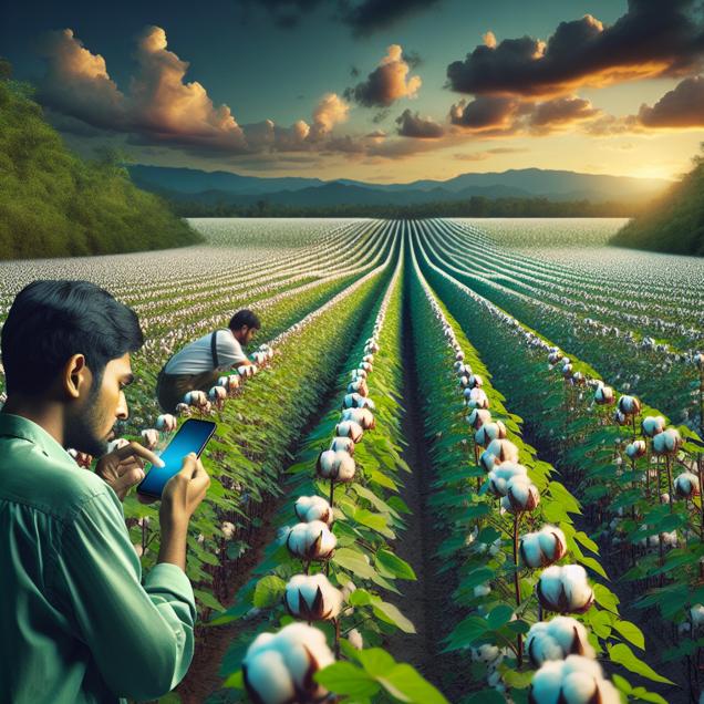 Prompt: Generate an image depicting a surreal scene set in a vast cotton field in Tennessee. Rows of genetically modified cotton plants extend into the distance, creating a mesmerizing pattern. In the midst of the sprawling greenery, a lone farm worker consults a smartphone, searching for "how to hide a body" on Google. The juxtaposition of the serene landscape with the eerie search on the smartphone creates a thought-provoking visual. Emphasize the tranquility of the cotton field and the stark contrast of the farm worker's actions. The depiction should include only scenes, people, and objects, it should not include text or speech bubbles.