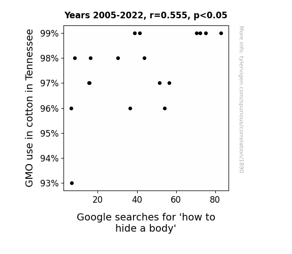 User prompt: Please provide potential search keywords for a paper titled Cotton Math: GMOs and Google Searches for 'How to Hide a Body' in Tennessee with an abstract of In this study, we investigated the rather curious connection between the use of genetically modified organisms (GMOs) in cotton cultivation in Tennessee and the prevalence of Google searches for 'how to hide a body'. Utilizing data from the USDA and Google Trends, we embarked on a statistical adventure to unravel this perplexing correlation. Our findings revealed a correlation coefficient of 0.5554573 and a p-value less than 0.05 for the period spanning 2005 to 2022. While the results may seem as bizarre as searching for cotton in a haystack, the implications are nothing short of amusing and thought-provoking. Join us as we unveil the peculiar link between biotechnology and internet queries about clandestine activities, bringing a whole new meaning to ethical concerns and harvesting information.