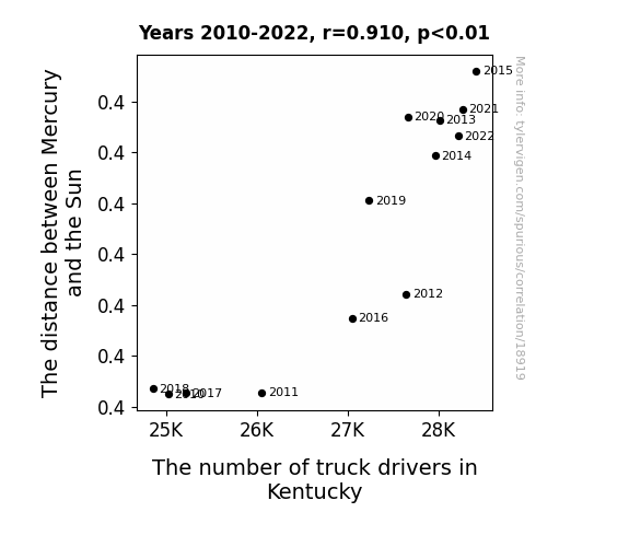This means 82.8% of the change in the one variable (i.e., The number of truck drivers in Kentucky) is predictable based on the change in the other (i.e., The distance between Mercury and the Sun) over the 13 years from 2010 through 2022.