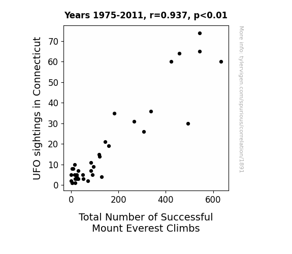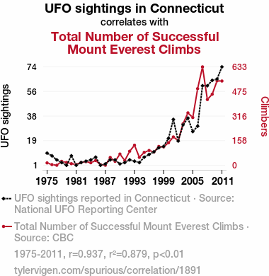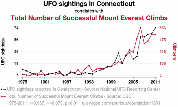 In simpler terms, it appears that as UFO sightings in Connecticut increased, so did the number of successful Mount Everest ascents. If this doesn't make you raise an eyebrow and exclaim, "E.T., phone home, we've got a mystery to solve!" then nothing will.