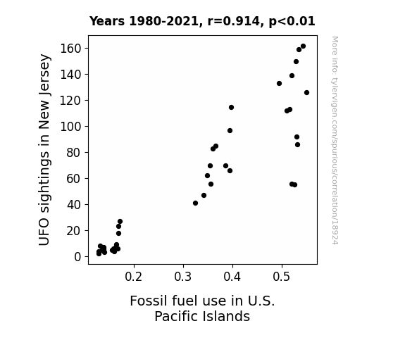 This means 83.5% of the change in the one variable (i.e., Fossil fuel use in U.S. Pacific Islands) is predictable based on the change in the other (i.e., UFO sightings in New Jersey) over the 42 years from 1980 through 2021.