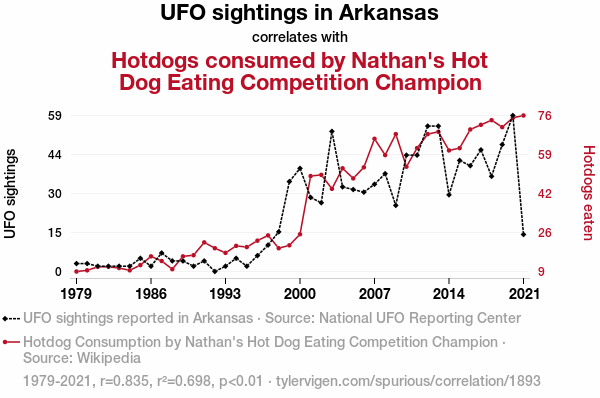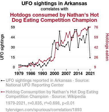 Arkansas UFO sightings, Nathan's Hot Dog Eating Competition, correlation coefficient, UFO sightings data, hotdog consumption data, National UFO Reporting Center, culinary competitions, cosmic curiosities, statistical significance, 1979-2021, UFO phenomena