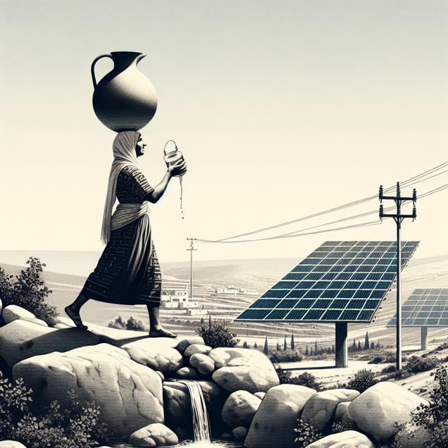 ChatGPT: A person in the Palestinian Territories carries a jug of water on their head, representing the low level of access to clean water. Nearby, solar panels shine in the sun, symbolizing the effort to generate electricity through sustainable means.