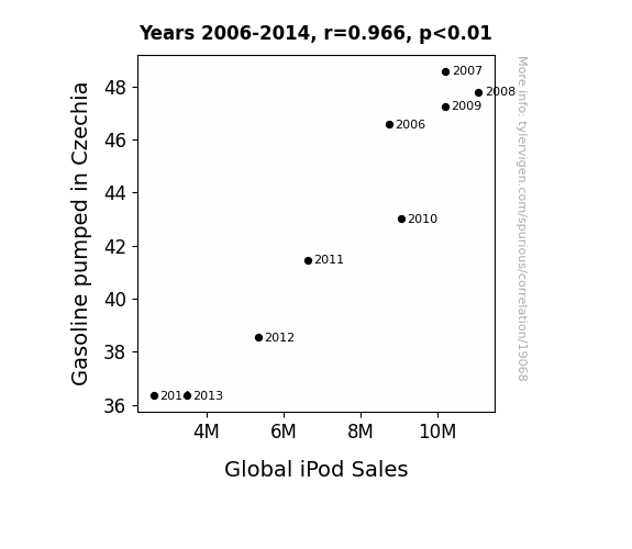 This means 93.3% of the change in the one variable (i.e., Global iPod Sales) is predictable based on the change in the other (i.e., Gasoline pumped in Czechia) over the 9 years from 2006 through 2014.