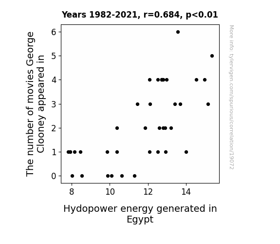 This means 46.8% of the change in the one variable (i.e., Hydopower energy generated in Egypt) is predictable based on the change in the other (i.e., The number of movies George Clooney appeared in) over the 40 years from 1982 through 2021.