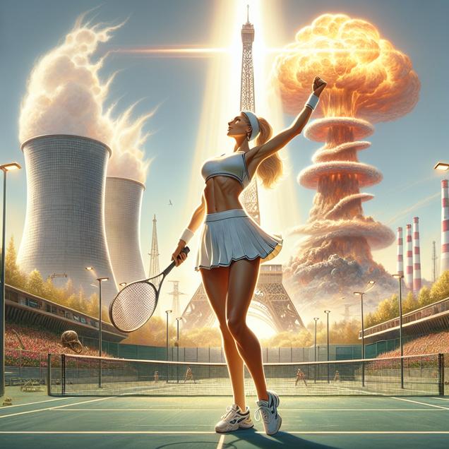 ChatGPT: Generate an image of Maria Sharapova in her tennis outfit celebrating a victory on a tennis court in France. The Eiffel Tower should be visible in the background, and nuclear power plants should be present, providing electricity for the country's energy needs. The scene should have a fantastical and epic feel reminiscent of Skyrim.