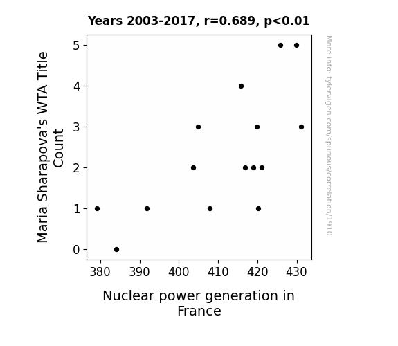 As researchers, we are often reminded that correlation does not imply causation, yet the allure of uncovering unexpected connections often supersedes the cautionary whispers of statisticians. With this in mind, we set out to explore the potential link between Maria Sharapova's WTA Title Count and the nuclear power generation in France over the period of 2003 to 2017.