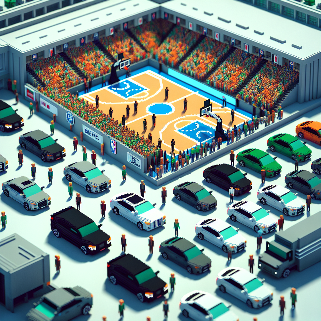 User prompt: Please respond with an image generation prompt that would be likely to create an interesting visual using DALLE-3, using the following style: [ Automotive recalls issued by Volkswagen Group of America: Voxel art ] and depicting this scene: In the scene, we see the sprawling NBA headquarters surrounded by vibrant basketball courts and eager fans buying tickets. The basketball courts are teeming with lively games and the spectators are excited. Meanwhile, a line of sleek Volkswagen cars is parked outside the headquarters, with workers diligently checking and fixing any potential issues. The scene embodies the interplay between the high revenue generated by the NBA league and the proactive measures taken by Volkswagen Group of America to address automotive recalls. Keep the visual depiction simple. Do not include any words or speech bubbles.