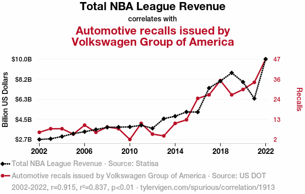 This means 83.7% of the change in the one variable (i.e., Automotive recalls issued by Volkswagen Group of America) is predictable based on the change in the other (i.e., Total NBA League Revenue) over the 21 years from 2002 through 2022.
